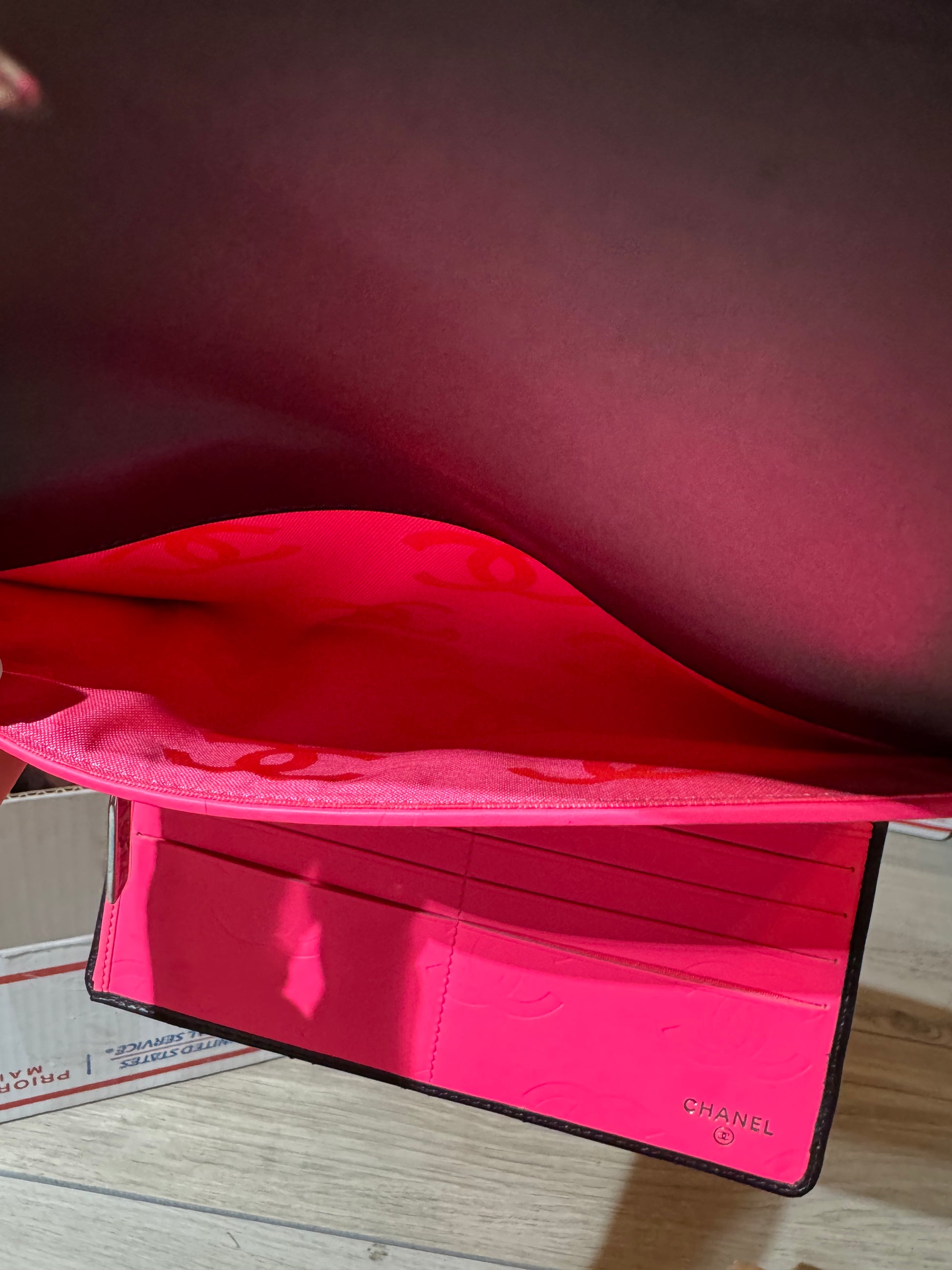 Make a bold statement with this stunning authentic Chanel Cambon Line trifold wallet, crafted in supple black leather with an embossed CC logo and a striking hot pink interior. This long wallet is as functional as it is fashionable, with plenty of compartments to keep your cards, cash, and essentials organized in signature Chanel style.