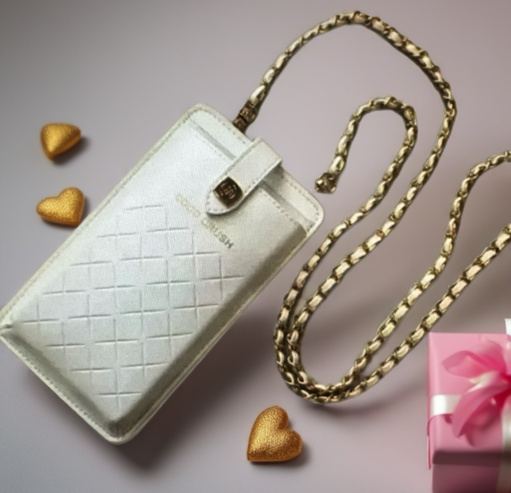 Chic, compact, and effortlessly stylish β this white Coco Crush-inspired crossbody phone holder is the perfect blend of fashion and function. It features quilted detailing, gold-tone chain strap, and a secure snap tab closure. Perfect for hands-free outings, events, or everyday glam.