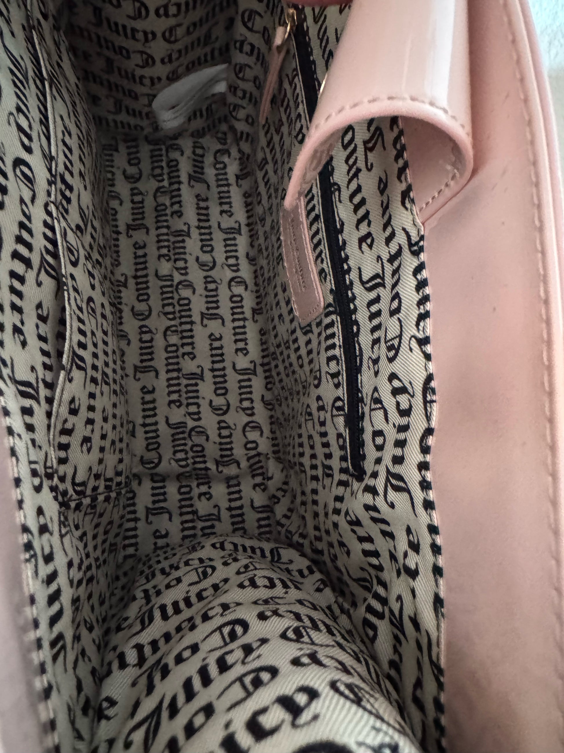 Soft blush velour with butterfly rhinestones and a matching heart coin purse. Spacious, dreamy, and so Juicy.