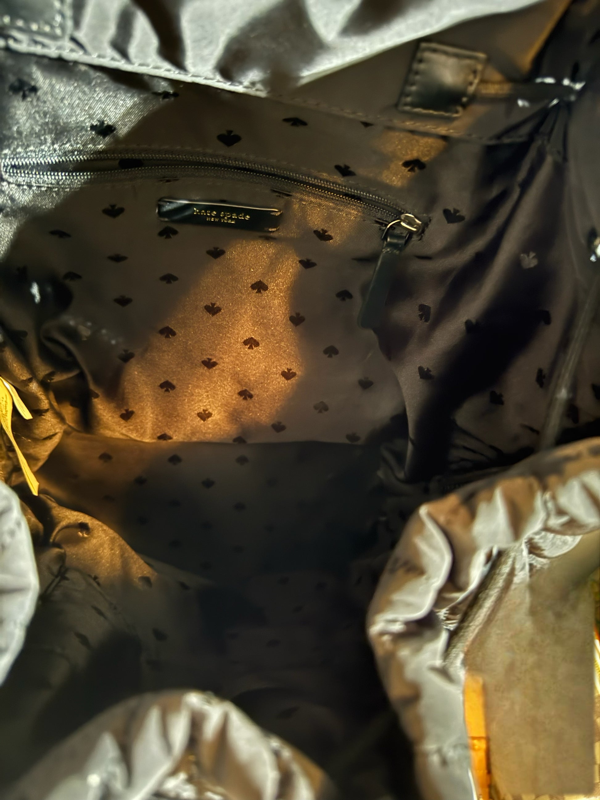 This chic quilted backpack by Kate Spade New York is the perfect blend of style and practicality. Crafted in soft quilted nylon with a subtle leaf pattern, it features a drawstring closure, magnetic snap flap, and exterior zip pocket for easy access on the go. Although it may appear gray in photos, the actual color is true black in person.