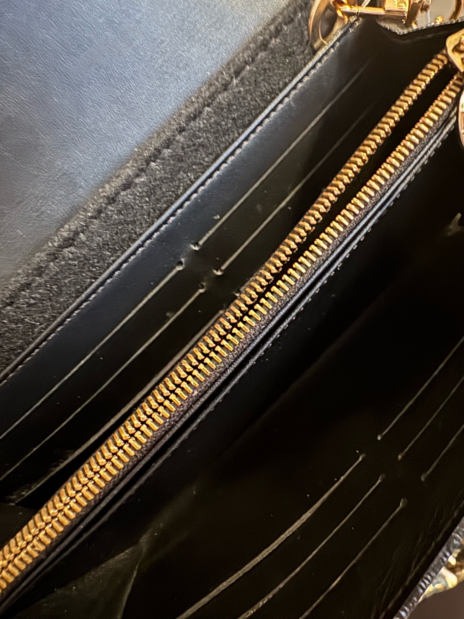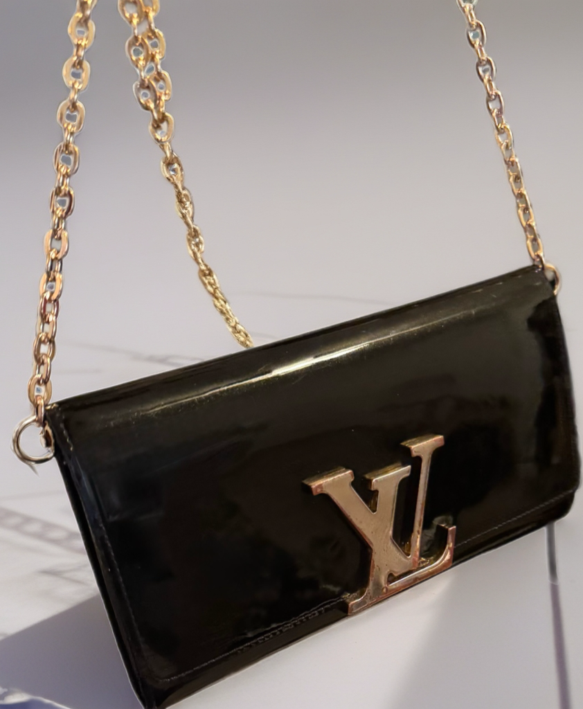 š¤ Louis Vuitton Black Patent Leather Chain Wallet ā Gold LV Logo
